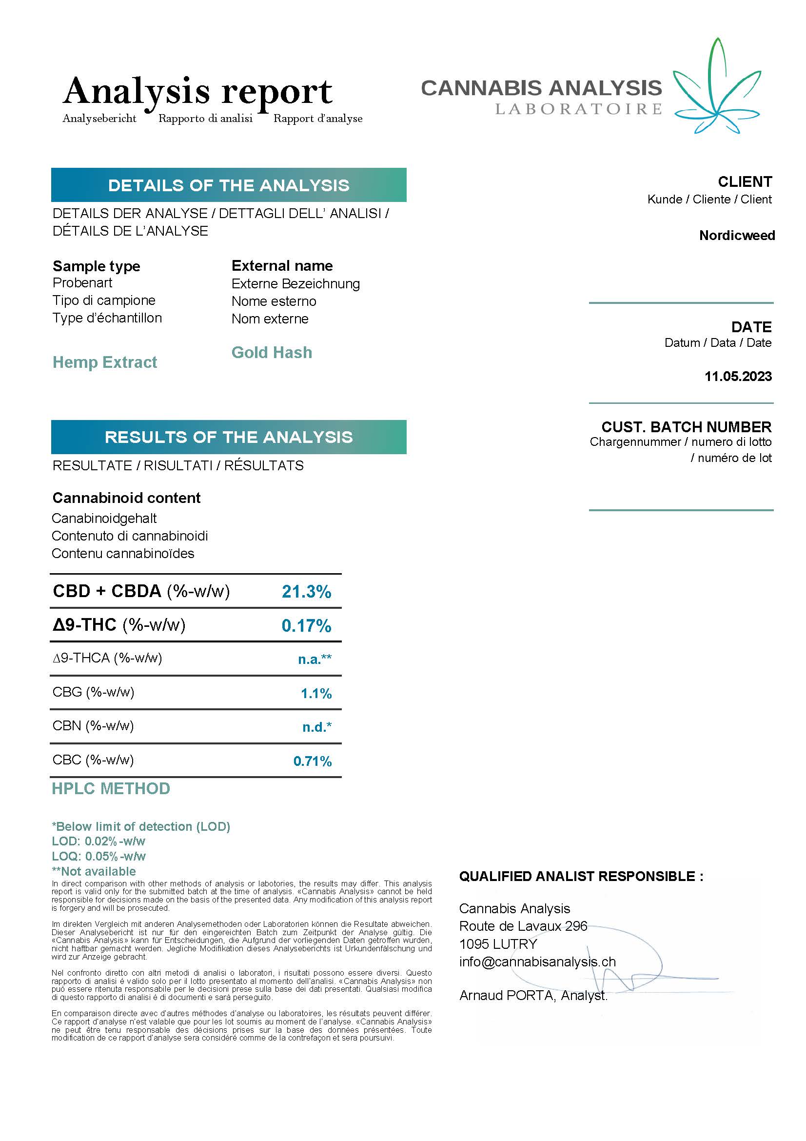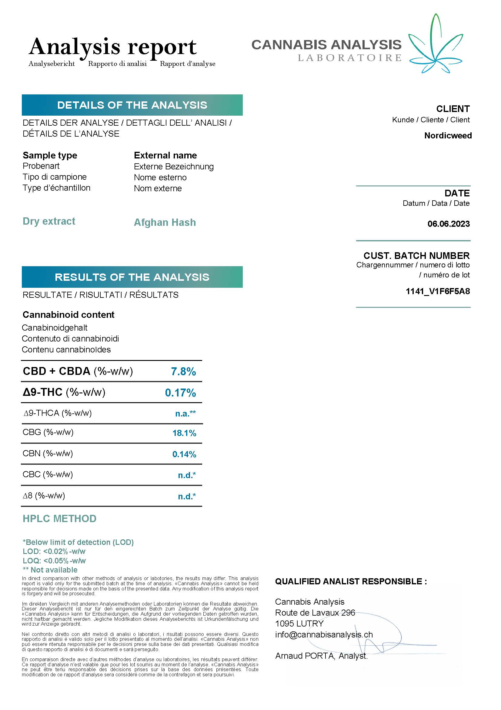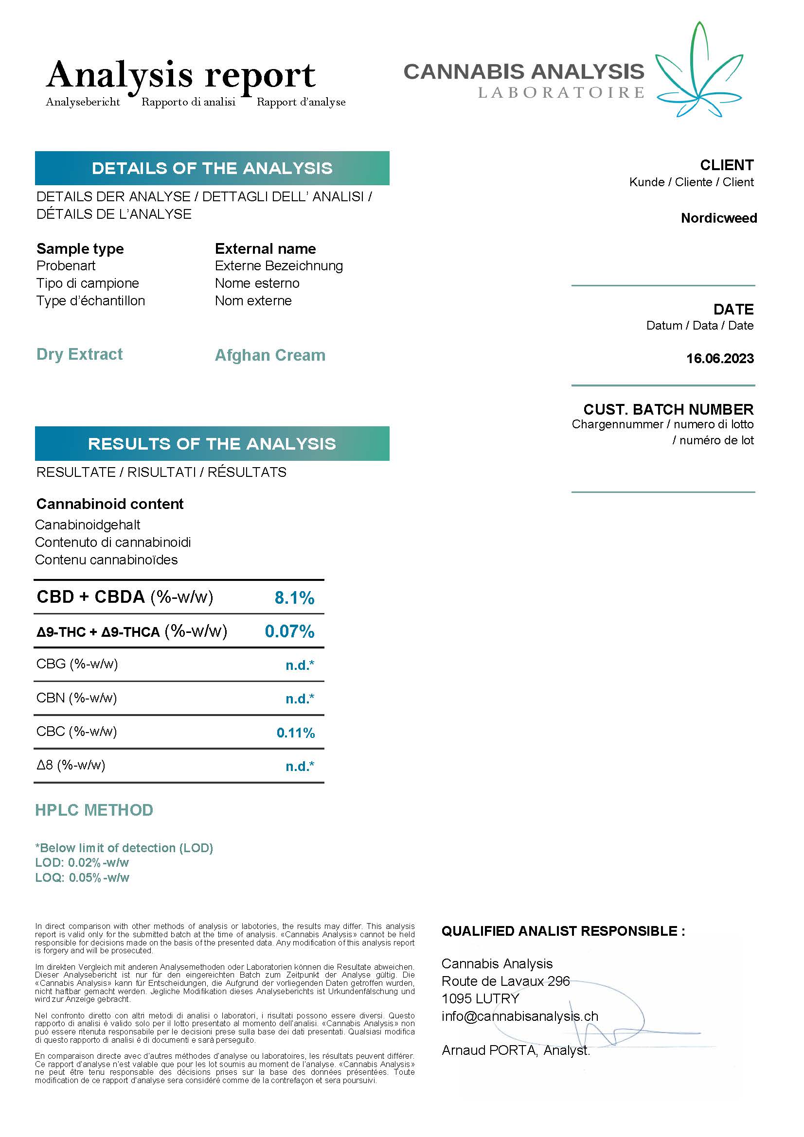 Analysemetode: Laboratorieanalyser baserer sig på stikprøver fra produktet. Især for produkter, der er infuseret med specifikke cannabinoider, kan der opstå variationer i koncentrationen i mindre prøver. Dette indebærer, at den faktiske koncentration af en given cannabinoide i produktet kan afvige fra den angivne værdi i laboratorieresultatet.