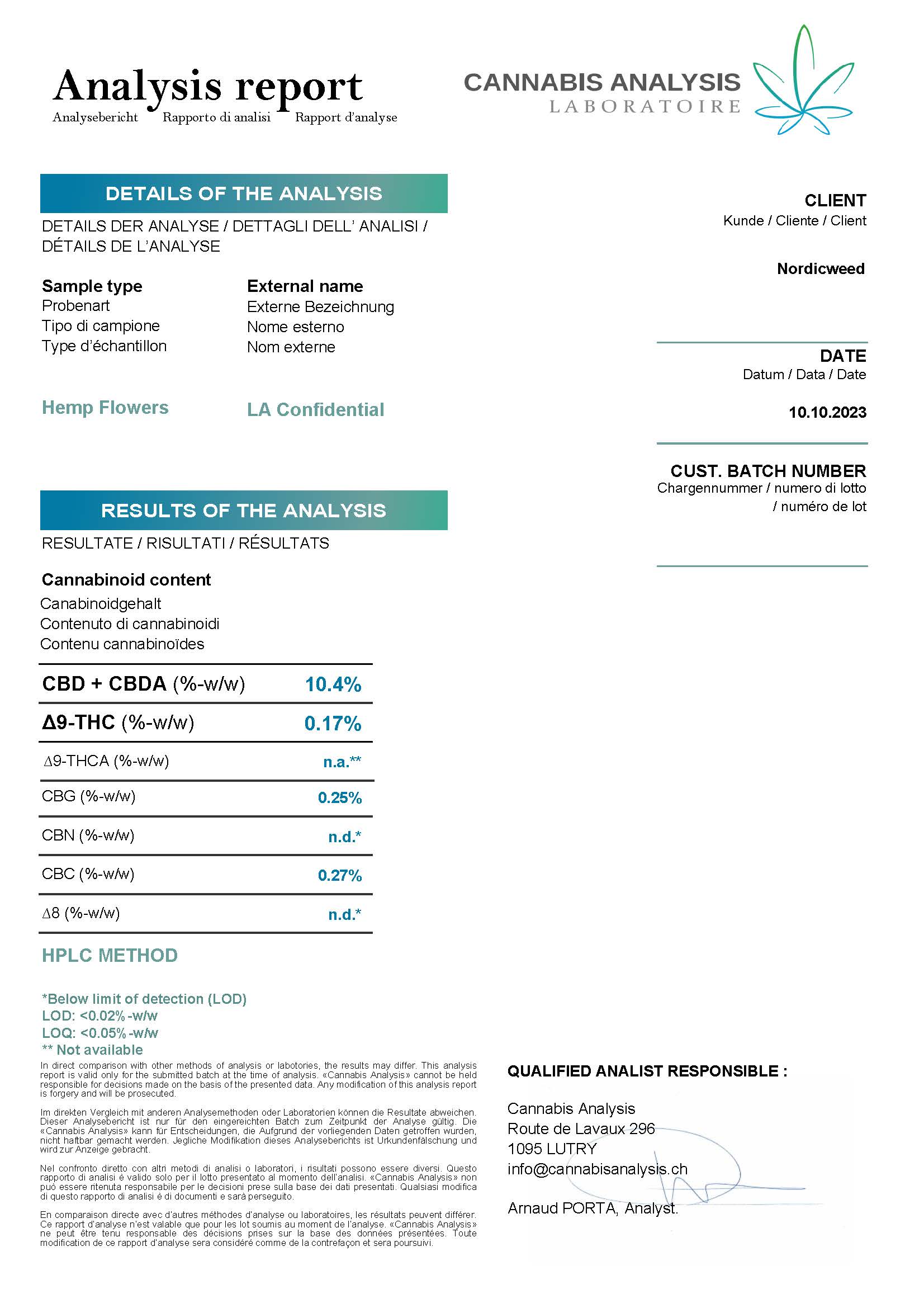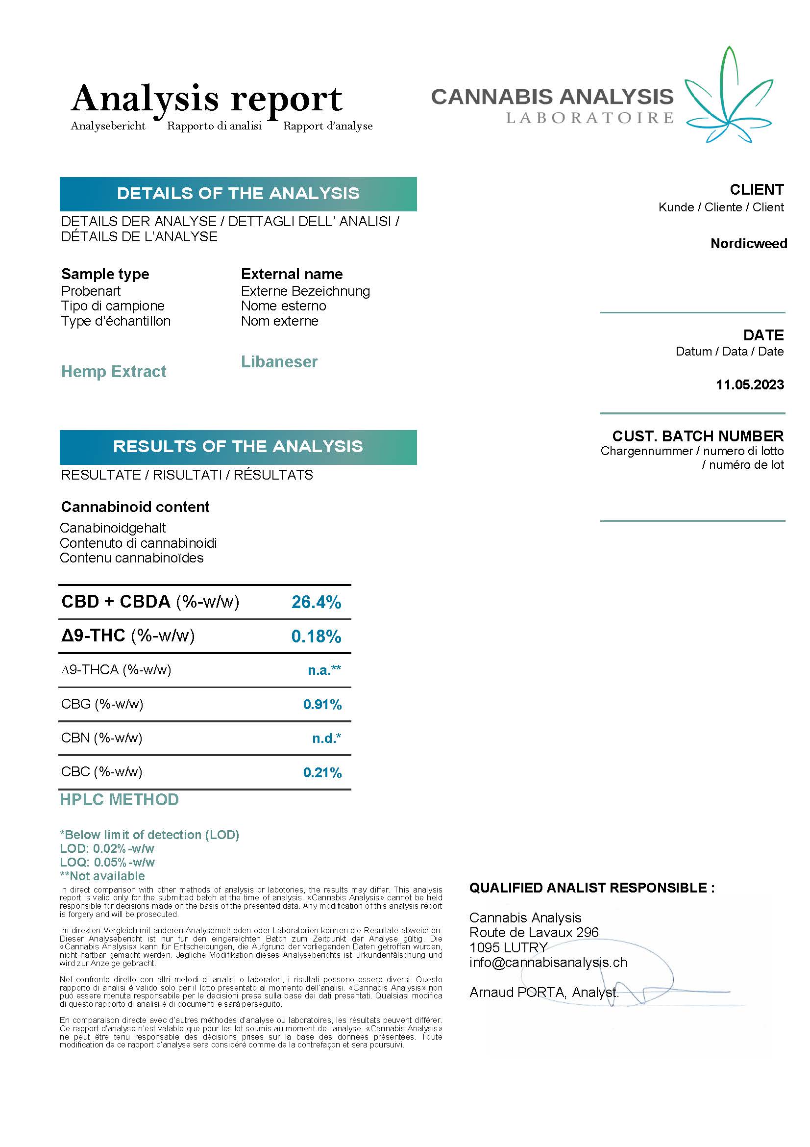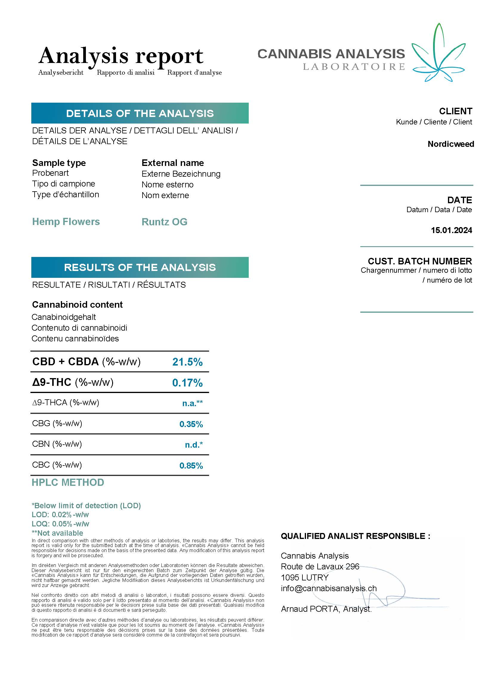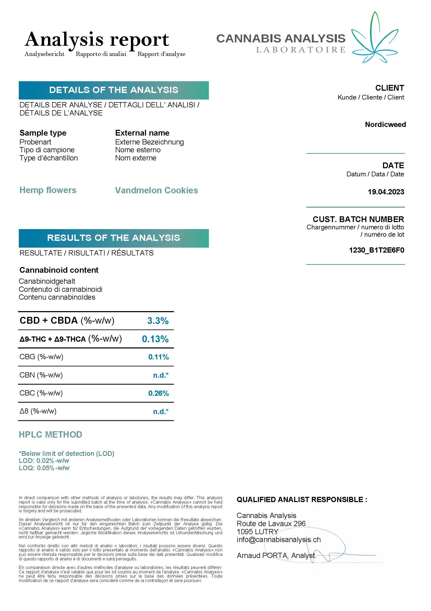 Analysemetode: Laboratorieanalyser baserer sig på stikprøver fra produktet. Især for produkter, der er infuseret med specifikke cannabinoider, kan der opstå variationer i koncentrationen i mindre prøver. Dette indebærer, at den faktiske koncentration af en given cannabinoide i produktet kan afvige fra den angivne værdi i laboratorieresultatet.